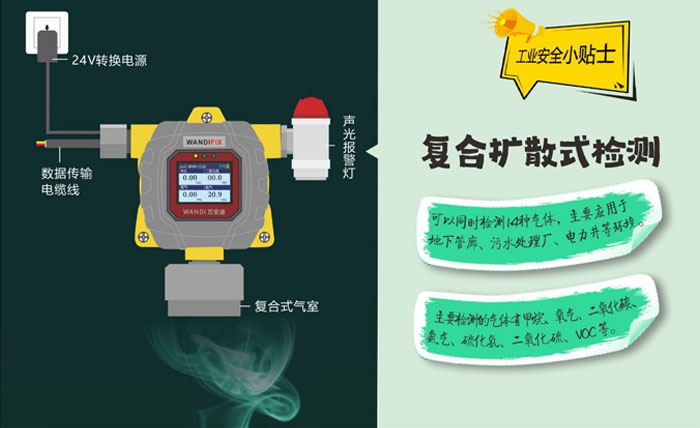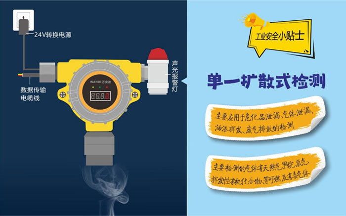 擴(kuò)散在線式氣體探測(cè)器能夠?qū)崟r(shí)的檢查空氣中是否含有一種或多種可燃及有毒有害氣體,一般使用于開放場(chǎng)合,如敞開的作業(yè)車間,檢測(cè)空氣中泄露的氣體。這種方法受檢測(cè)環(huán)境的影響,如環(huán)境溫濕度、風(fēng)速風(fēng)向等,監(jiān)測(cè)數(shù)據(jù)會(huì)存在一定的誤差。