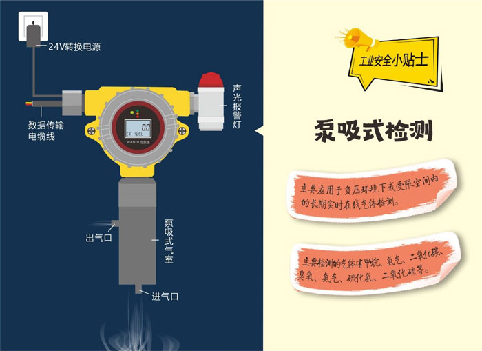 泵吸在線式氣體探測(cè)器一般適用于人不宜進(jìn)去的地方,或在作業(yè)人員進(jìn)入之前,就必須進(jìn)行檢測(cè)的地方。如坑道、管道、下水道、密閉糧倉(cāng)、罐體等環(huán)境。也可以在氣室進(jìn)氣口接入通氣長(zhǎng)管,遠(yuǎn)距離進(jìn)行吸氣采樣。檢測(cè)速度快,準(zhǔn)確率也比較高。